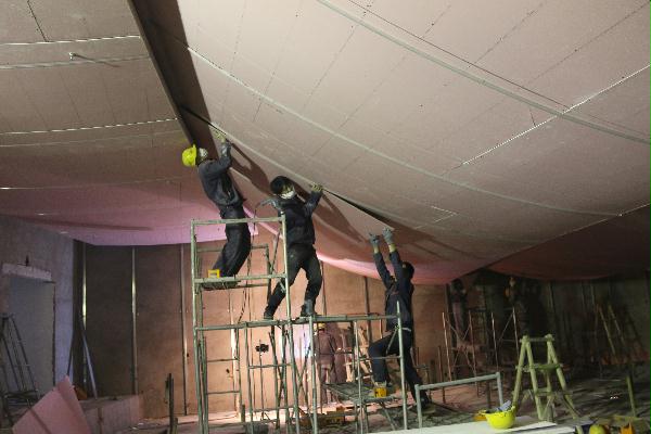 3、礼堂观众厅吊顶工程造型复杂,施工难度较大,现已完成工程量的70%。观众厅墙面龙骨安装已经完成,随后将对墙面的石材装修进行施工。