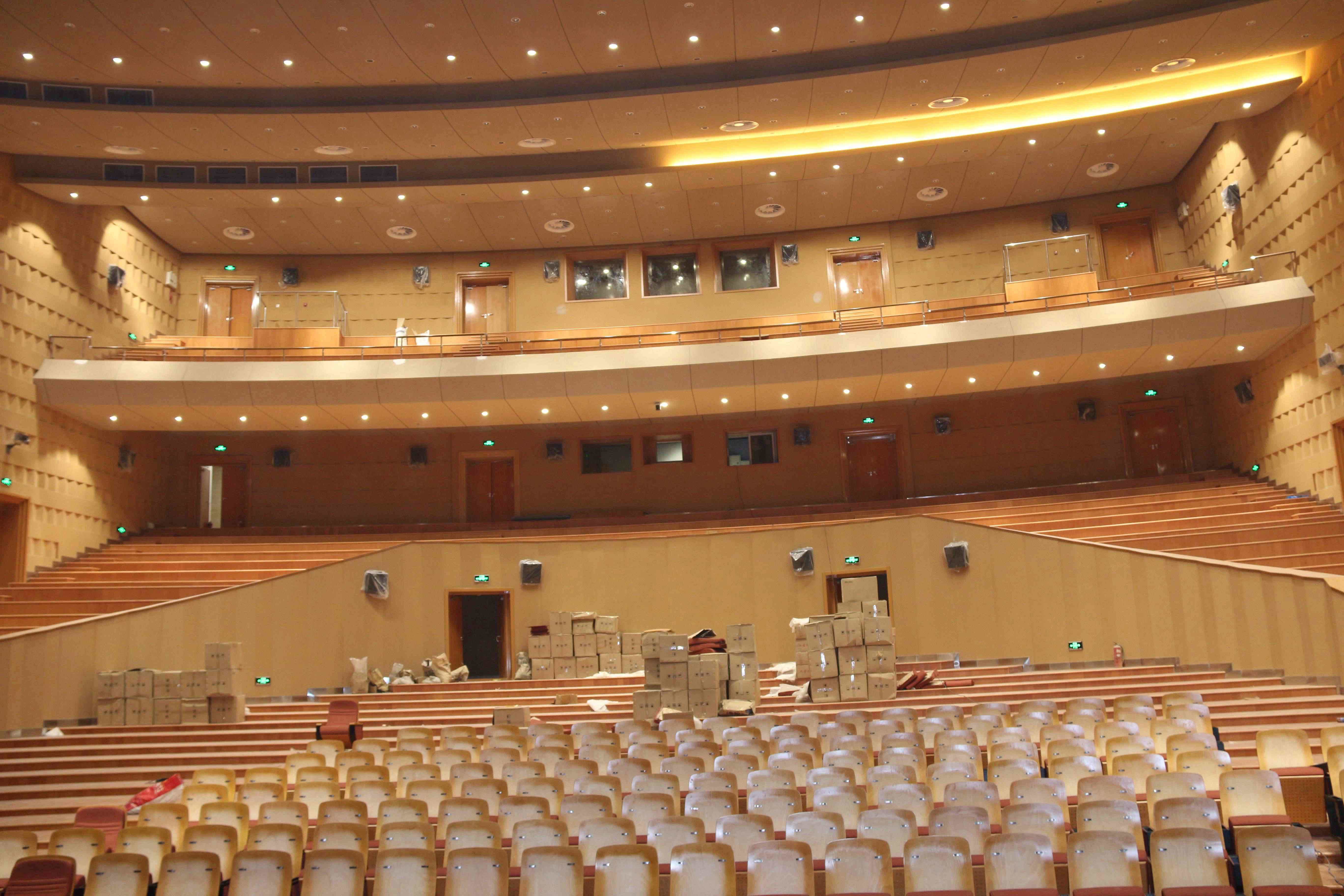 2、观众厅地面复合实木地板铺设完成,礼堂座椅的安装工作正在加紧施工。